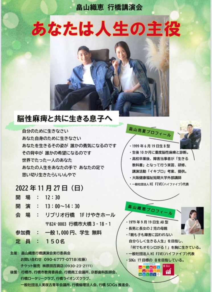 2023年3月4日(土)兵庫県姫路市におきまして、畠山織恵・畠山亮夏親子登壇をさせて頂くことになりました。今回の講演会は、昨年息子が挑戦しました「動けない、話せない。でも伝えられる大学講師にオレはなる!」クラウドファンディングに対しハリウーマン... -