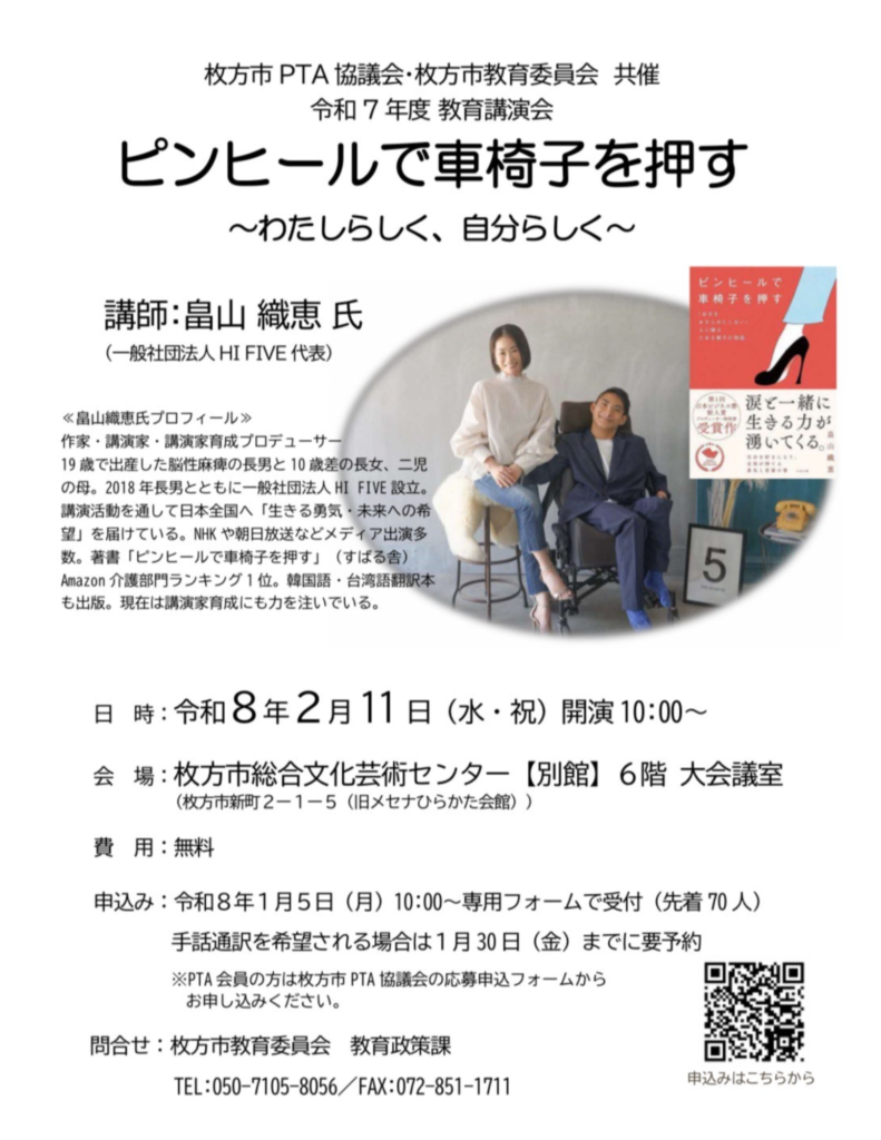 全国各地での畠山織恵講演会、開催が決定しているものをご紹介いたします。 申込受付中 2026年1月25日㈰時間:14:00~15:30会場:さいたま共催会館 お申し込みはこちら チラシのダウンロードはこちら 2026年2月11日(水・祝)時間:10:00~11:30会場:枚方市総合文化芸術センター 別館 6階 大会議室 お申込はこちら チラシのダウンロードはこちら 開催決定(申込受付開始次第ご案内します) 2026年6月6日(土)千葉県市川市 お知らせ講演会開催予定 ほ・とせなNewsさんに取材いただきました! 大阪八尾市講演会ご報告 関連記事 ■意思伝達装置、最後の砦?!現る。 2024.03.07 参加者自己肯定感UP 81.5%!!-畠山織恵による講演会を主催してみませんか?- 2024.09.03 朝日放送系列番組で取り上げていただきました! 2018.12.06 Yahoo!ニュース掲載記事|第3話✨【息子は25歳で一人暮らしを実現「ようやったやろと、父にいつか言いたい」 2025.06.06 クラファン【書籍寄贈先のご報告・2024年1月~4月】 2024.05.15 講演会のお知らせ 大阪府東大阪市 2025.02.08 期間限定で個別相談・ファッションコンサルを提供予定です! 2023.04.06 「生きる力」を守口市へ!市内全22小中学校へピンヒール本寄贈が決定!! 2024.04.16